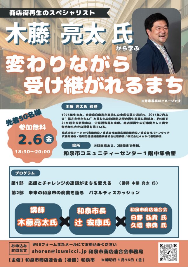 和泉市商店連合会(会長:日野弘貴)では、商店街の活性化や地域との連携の強化を図るため、商店街再生のプロといわれている木藤亮太氏を講師にお招きし、別添のとおり令和8年2月6日、講演会を開催いたします。