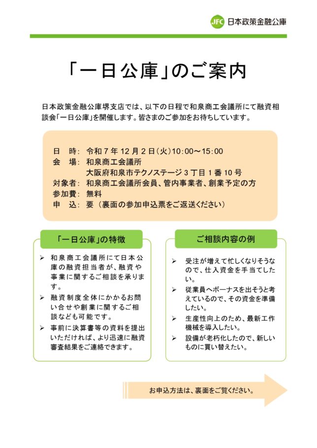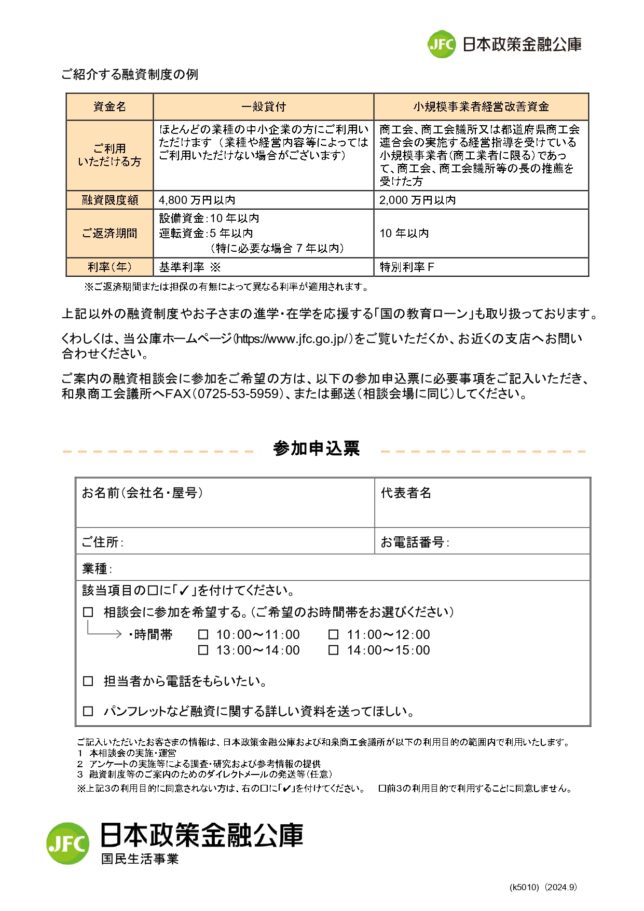 ②Faxからの申込みは、チラシ(PDF)を印刷の上、泉大津商工会議所宛て